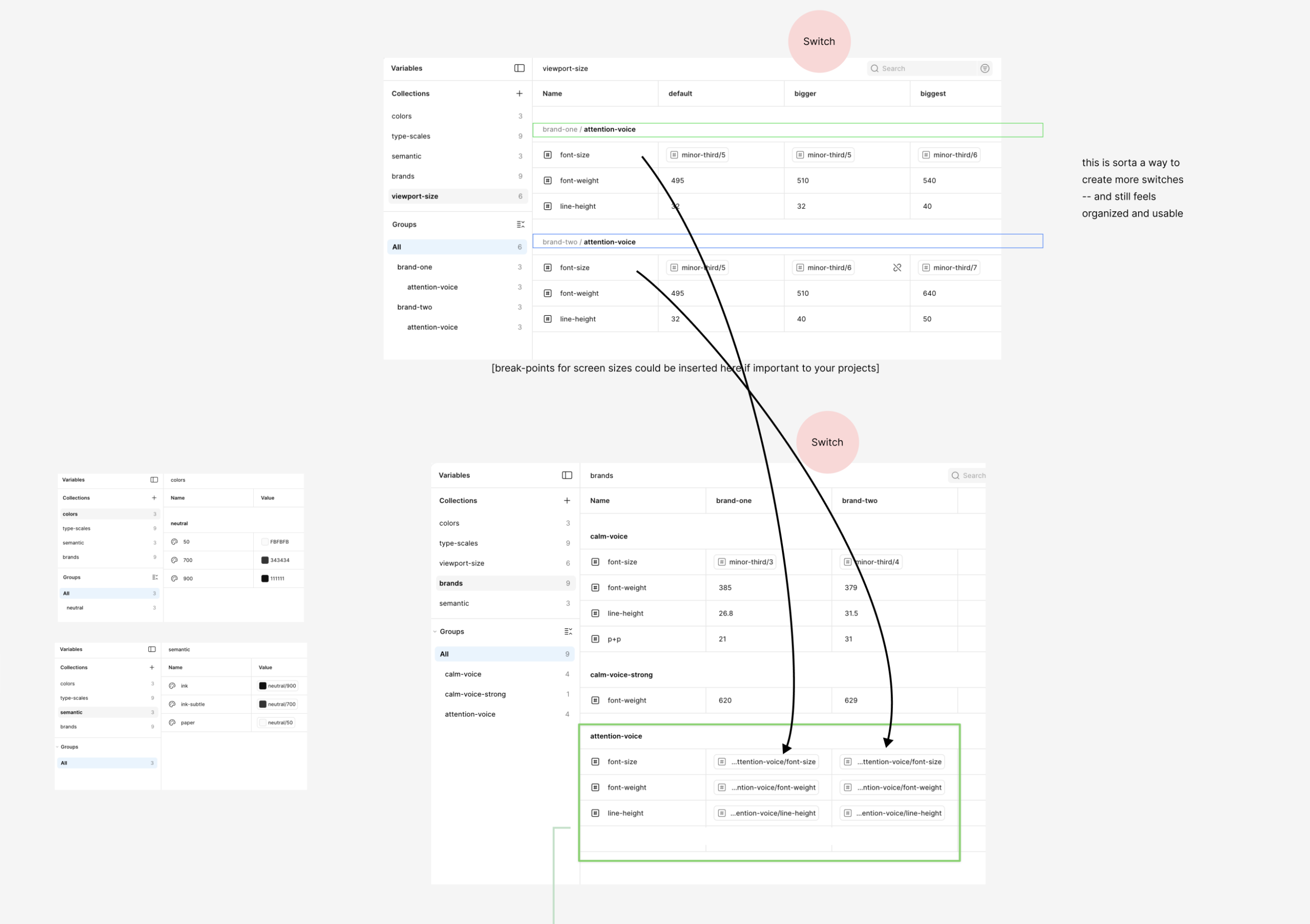 Here are some explorations on how we can bend Figma collections to our will and get a system that can emulate what we can do in the code.