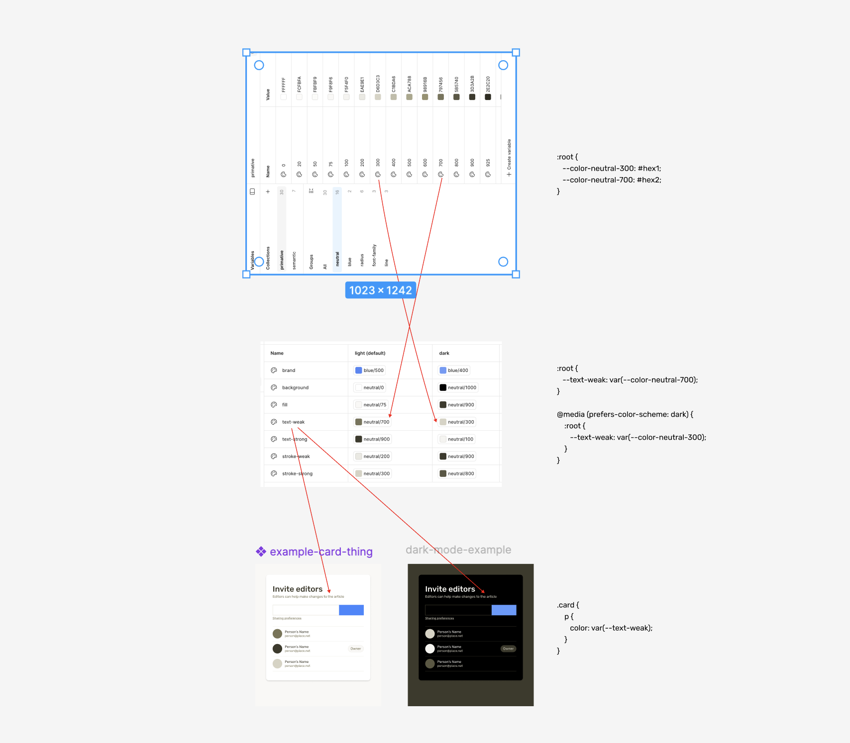 Here’s a Pen that looks at dark mode + density and how to adjust variable font-weight for lite text on dark backgrounds – that follow this prompt to explore how the Figma collections and CSS differ.